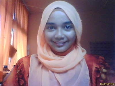 taraaaaaaaa,,,, me with my own syle of wearing shawl,,,, quite messy,,, but,, do i look like i care with that show-off smiling face? hehe,, berkilat-kilat kena table light aku,, hilang segala cela di muka,, huhu,, so,, the keyword here is lighting,, or the importance of lighting while webcaming,, haha,, webcaming is not a good choice of word,, but,, i am like a boss,,, so,, webcaming is allowed here,, :D